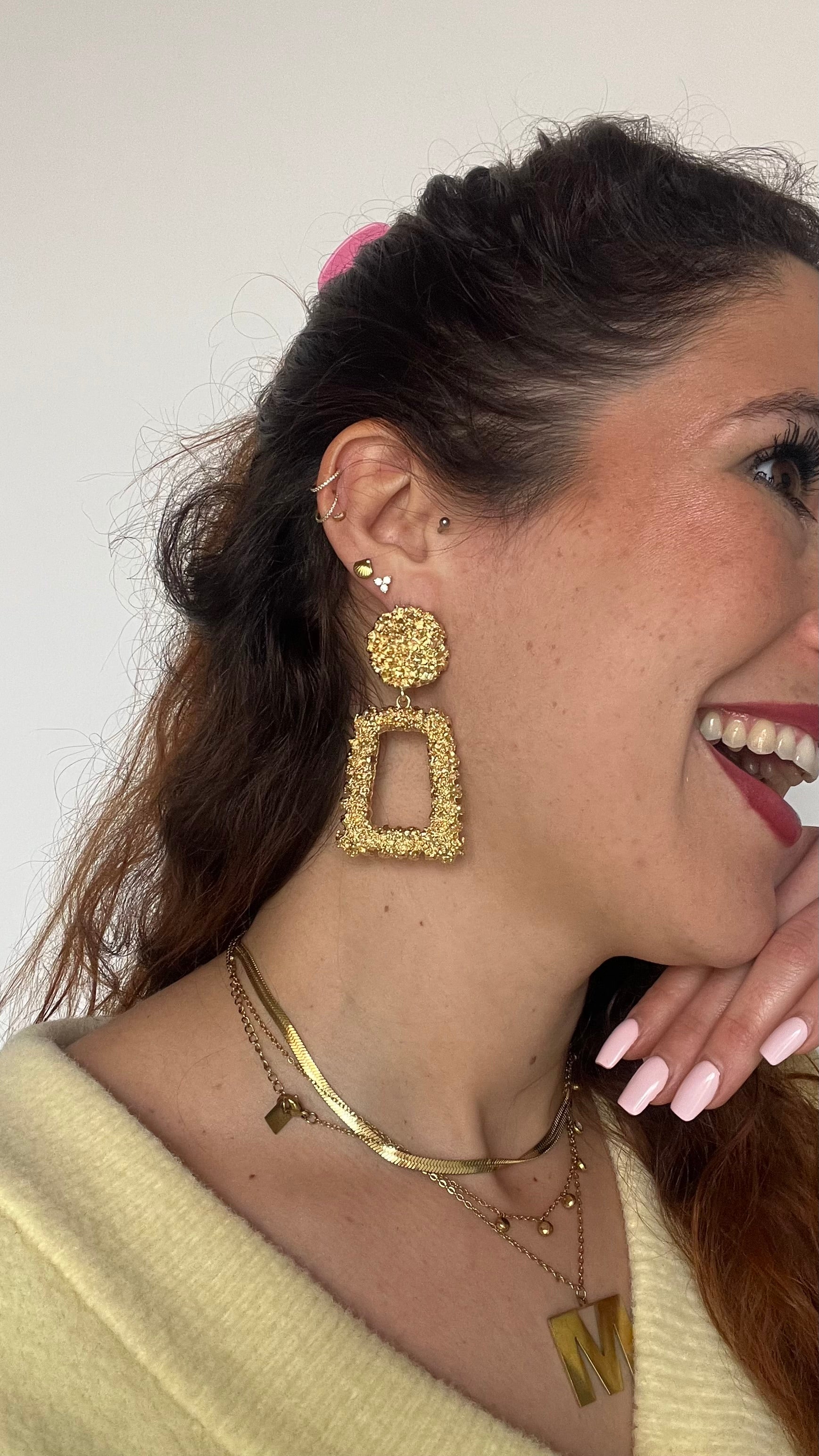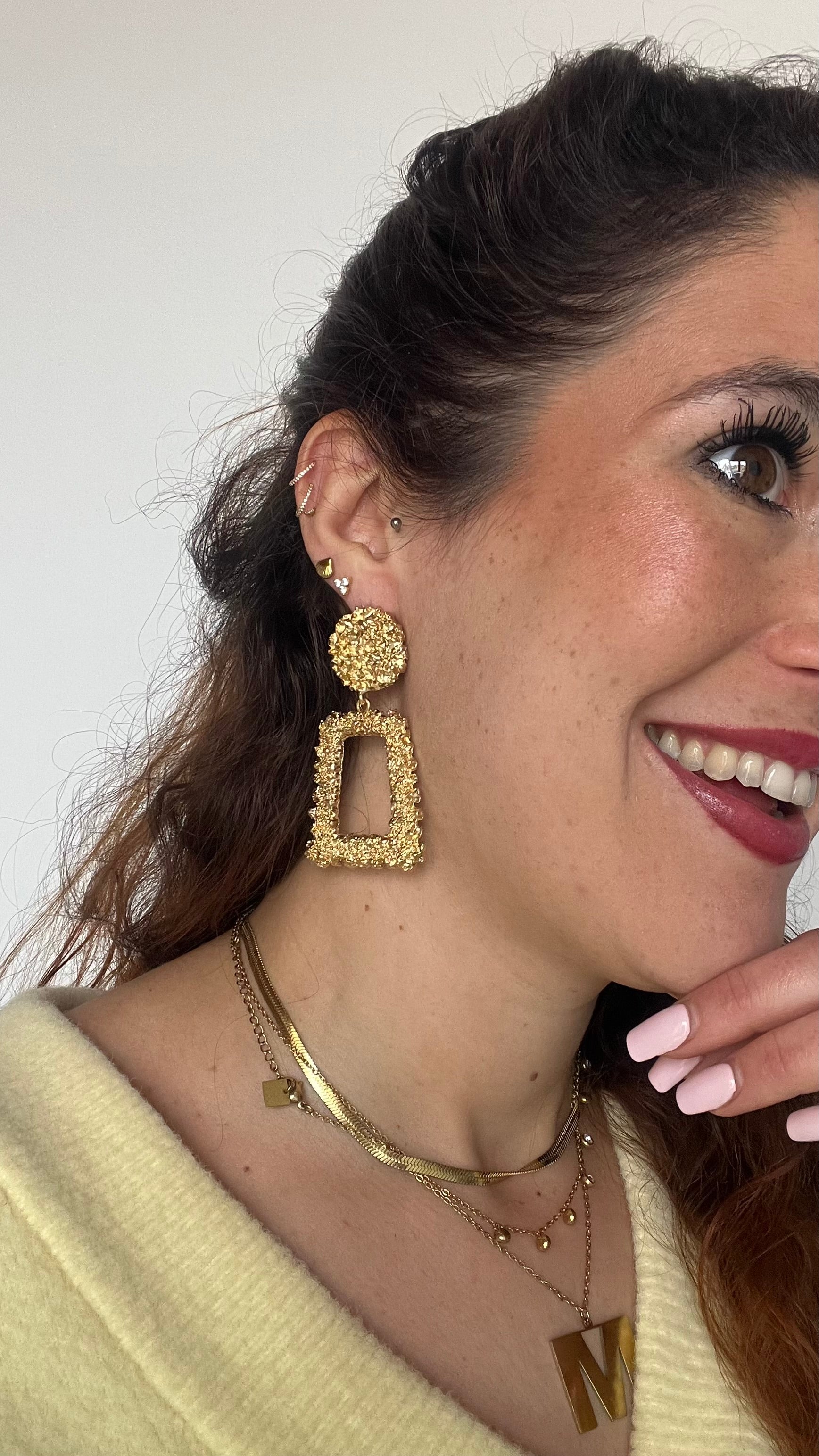 Large party earrings with a rustic design. They are rectangular in shape with a matching round clasp. They are a must for your party looks! They are made of zamak and are available in gold and silver plating.