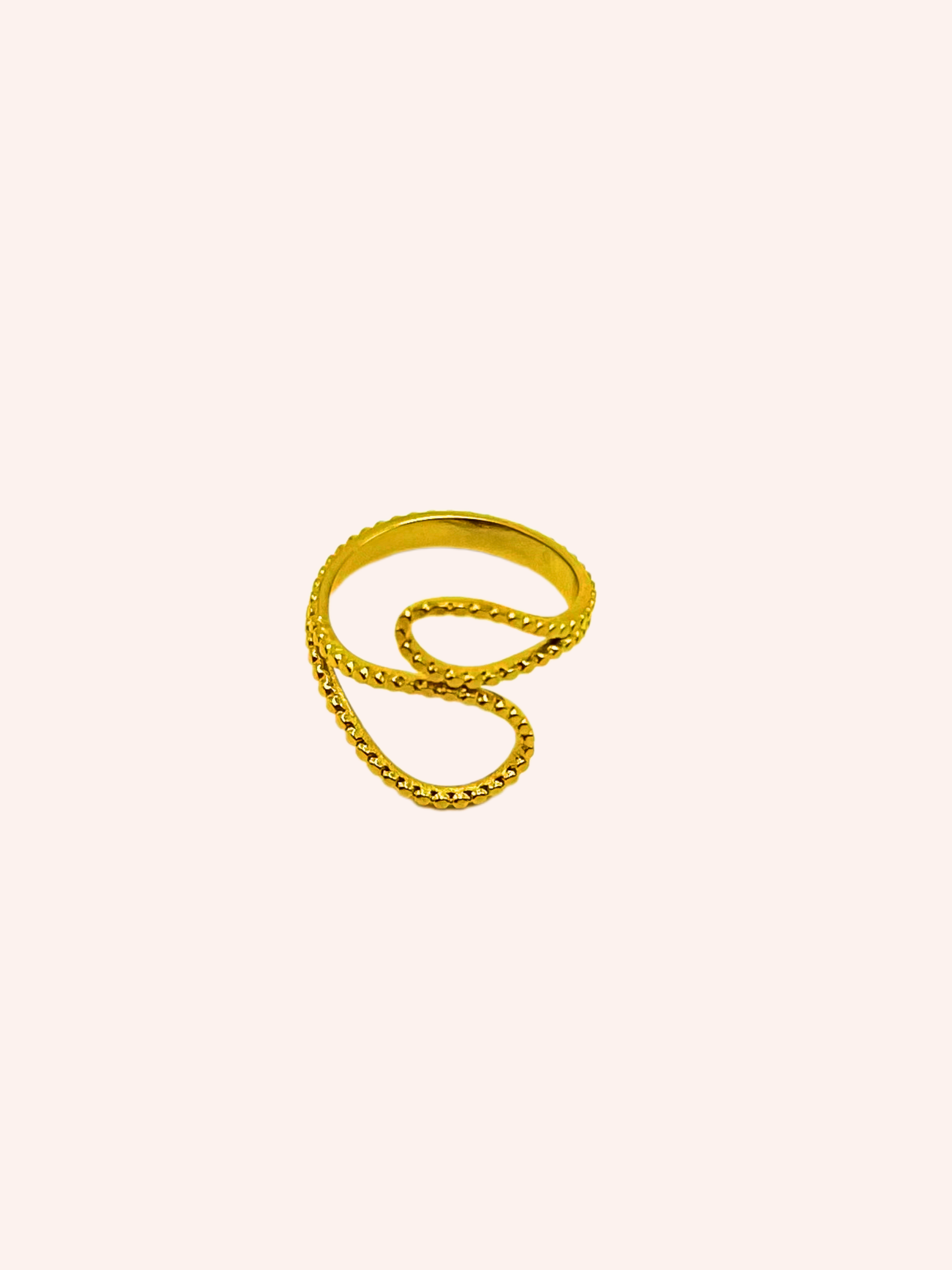 Anillo con diseño de 2 ondas entrelazadas en el centro. Es de acero inoxidable dorado. Es regulable y ajustable a tu medida.