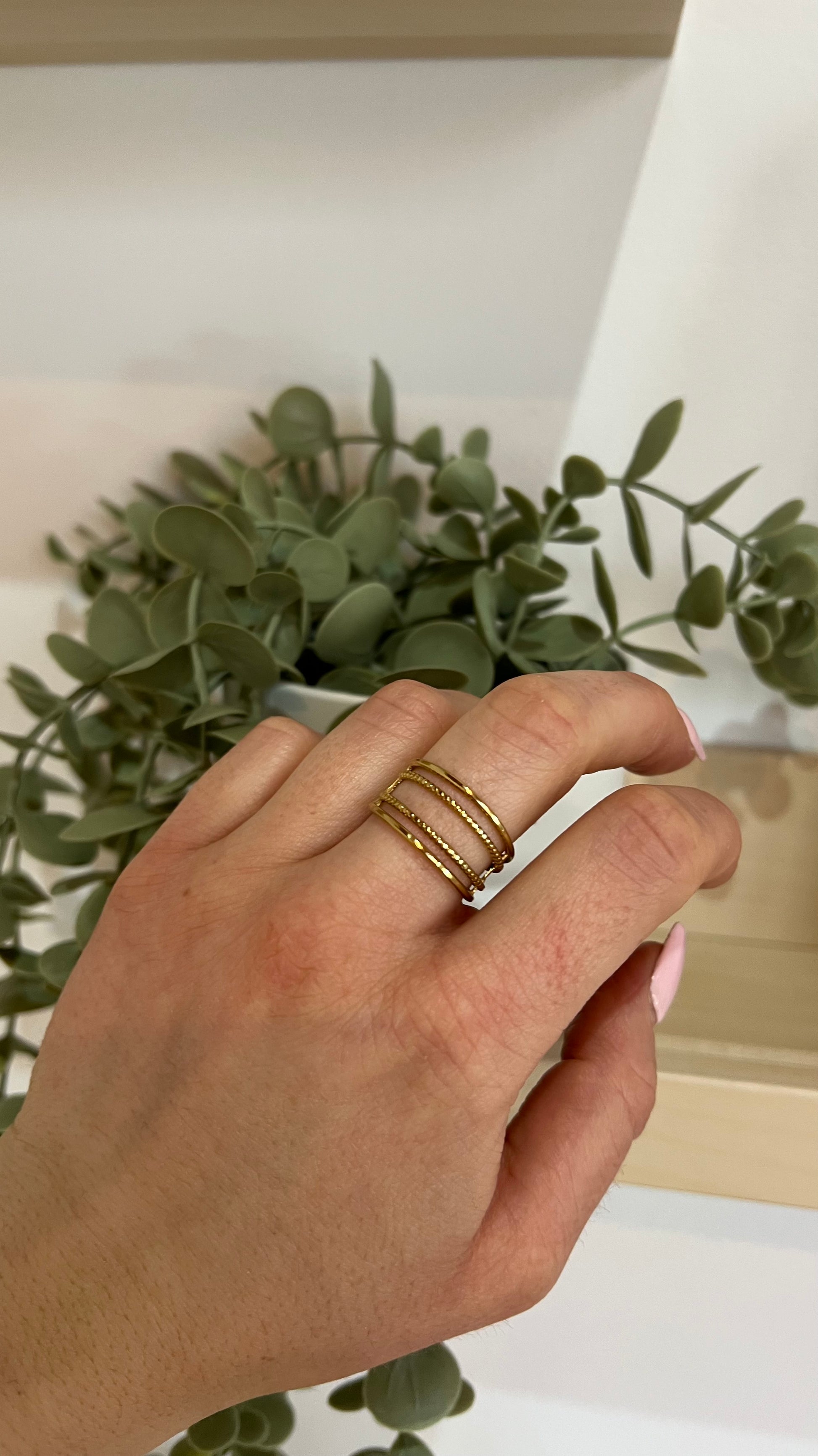 Anillo con diseño de 4 líneas, dos rugosas y dos lisas. Es de acero inoxidable dorado. Es regulable y ajustable a tu medida.