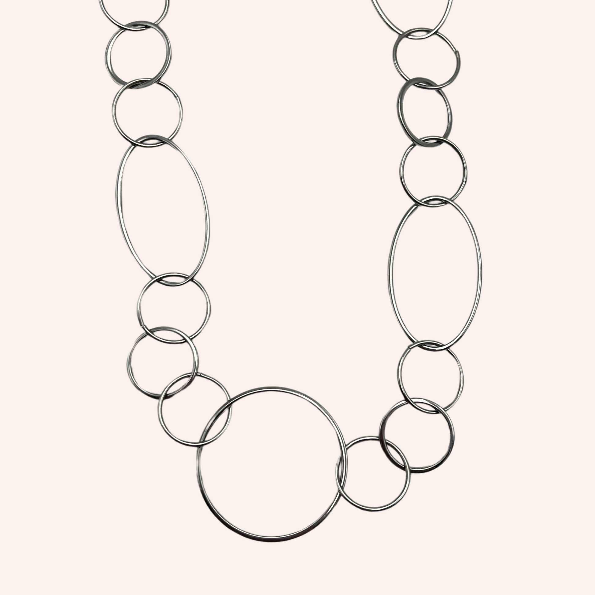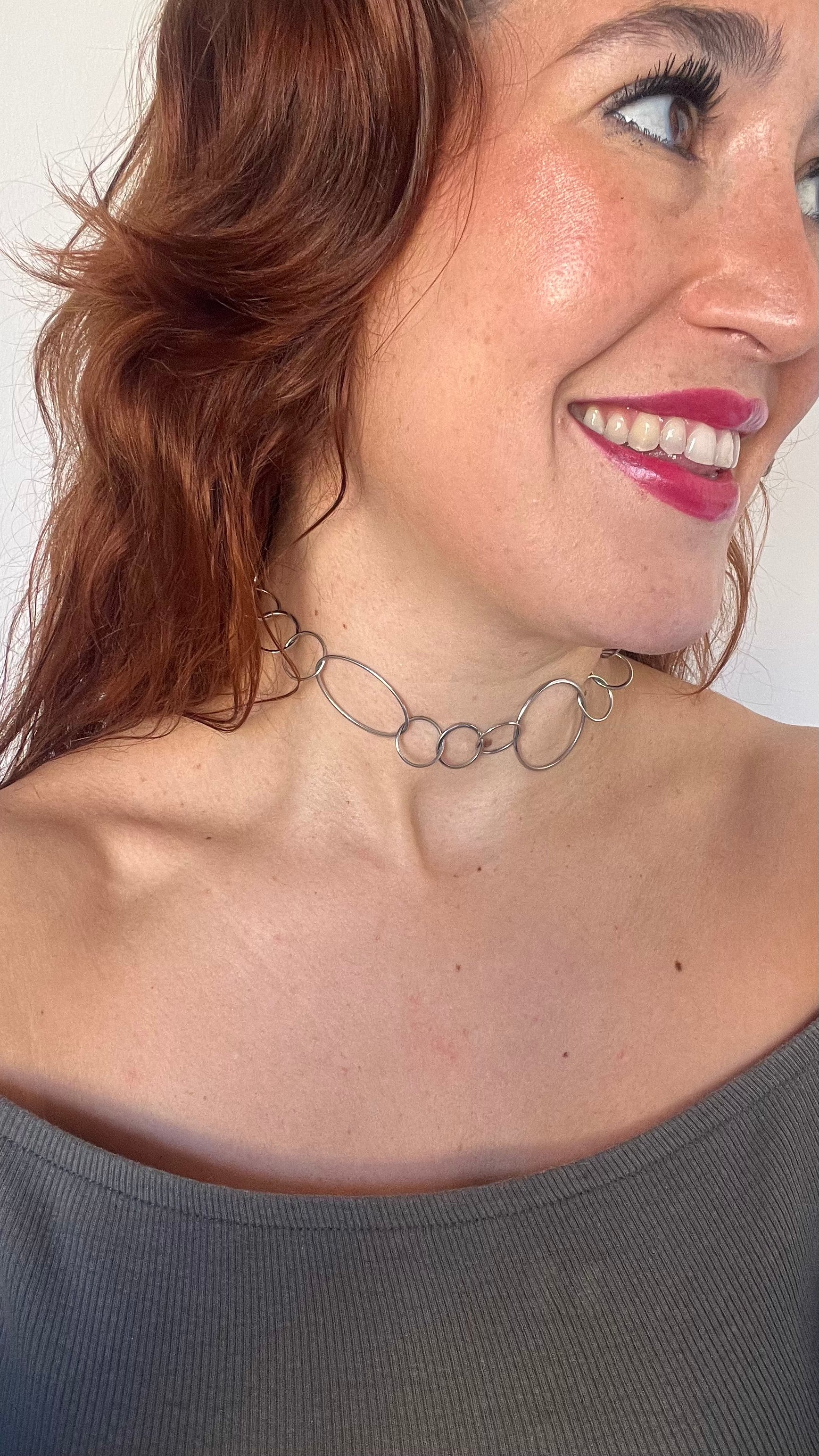 Cadena de acero inoxidable con eslabones redondos en dos tamaños distintos. Tiene dos posiciones para usarla como choker o como colgante, tal como se puede apreciar en las fotos. Perfecto para combinar con otros colgantes y verte guapa y elegante!