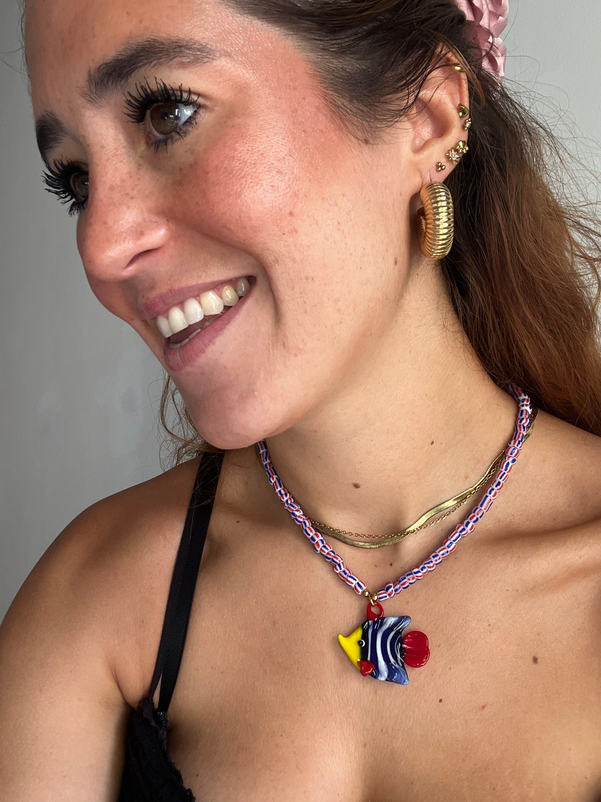 Colgantes super en tendencia con motivos marinos de abalorios azules o rojos y un pez o una estrella de vidrio. Está muy de moda!