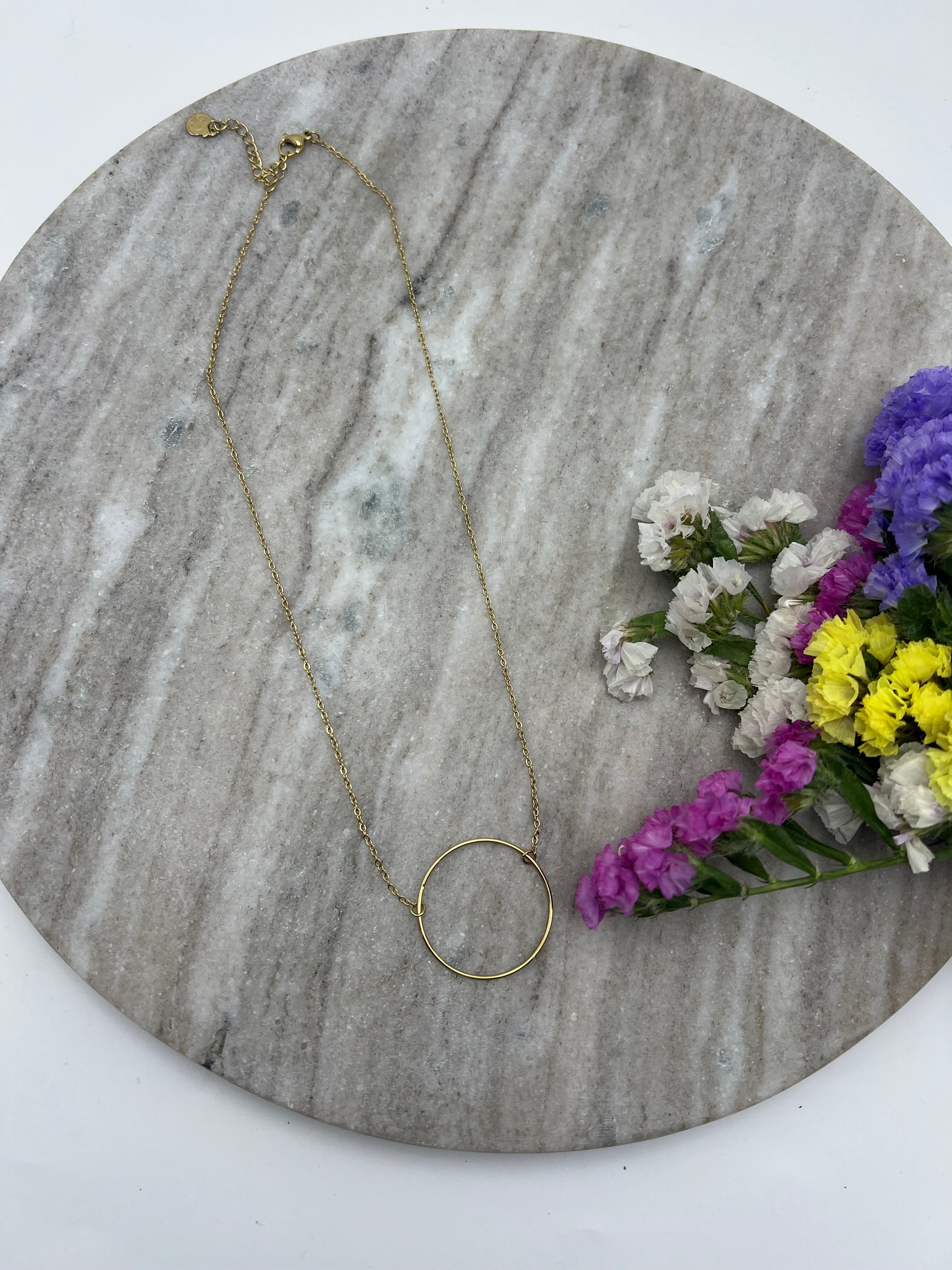Collar de acero, de cadena fina, con una circunferencia en medio de 4x4cm. Precioso y muy elegante.