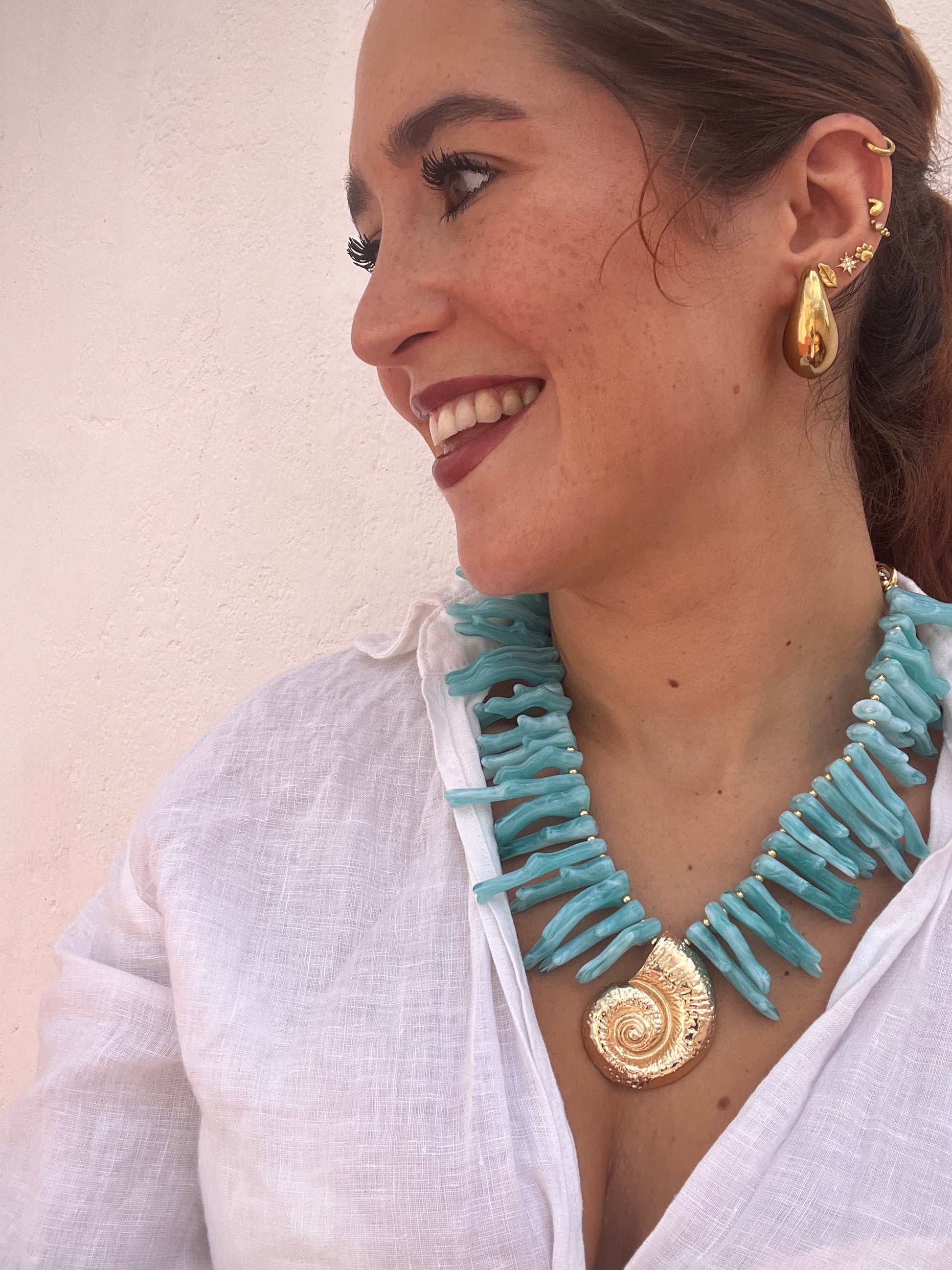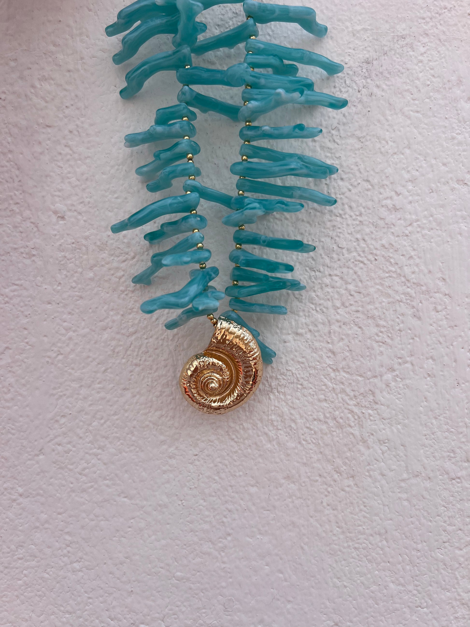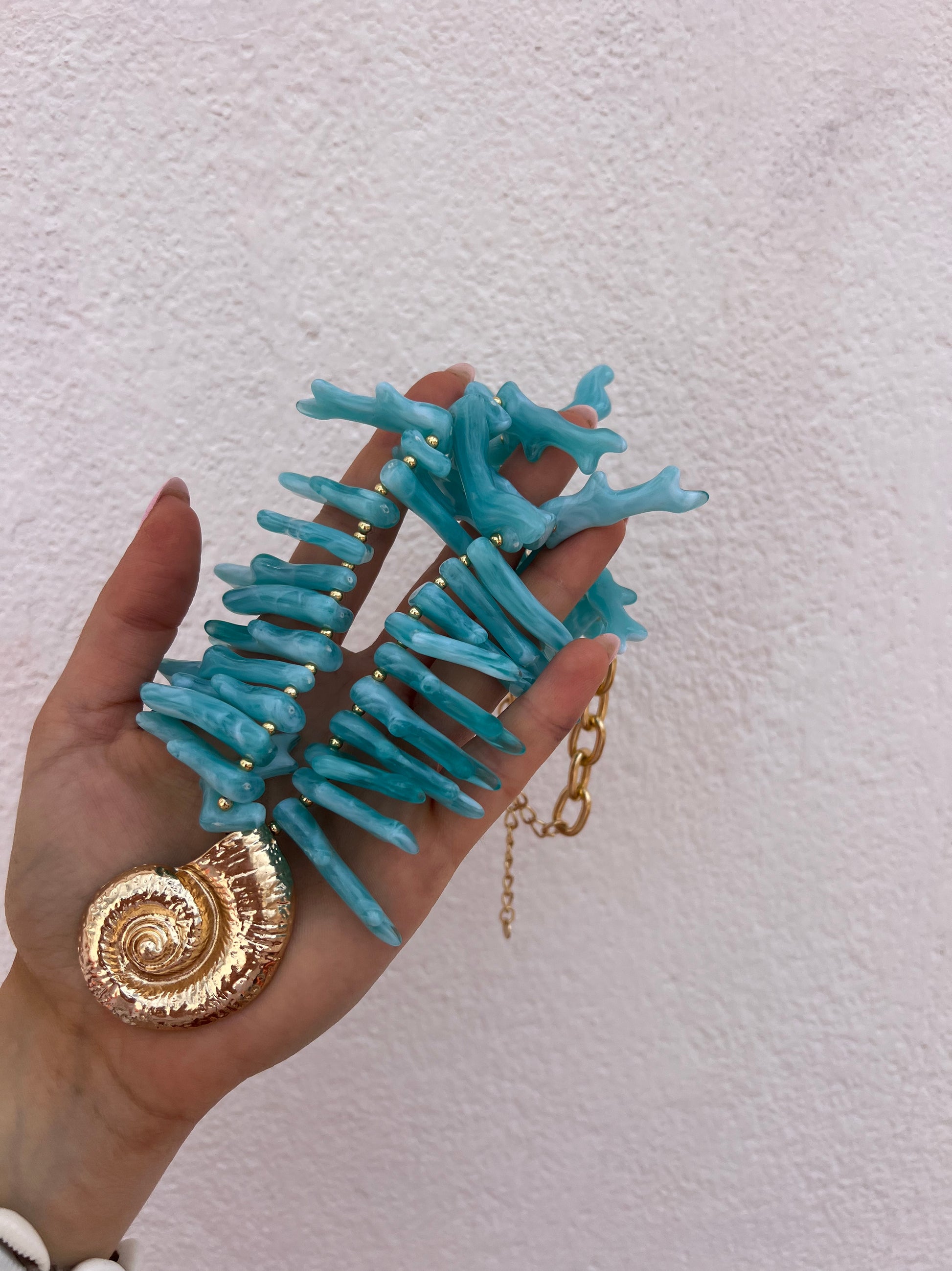 Colgante grande formado de coral color turquesa o conchas pequeñas blancas y bolitas blancas a combinación con doradas. Tiene una concha grande dorada central de zamak.