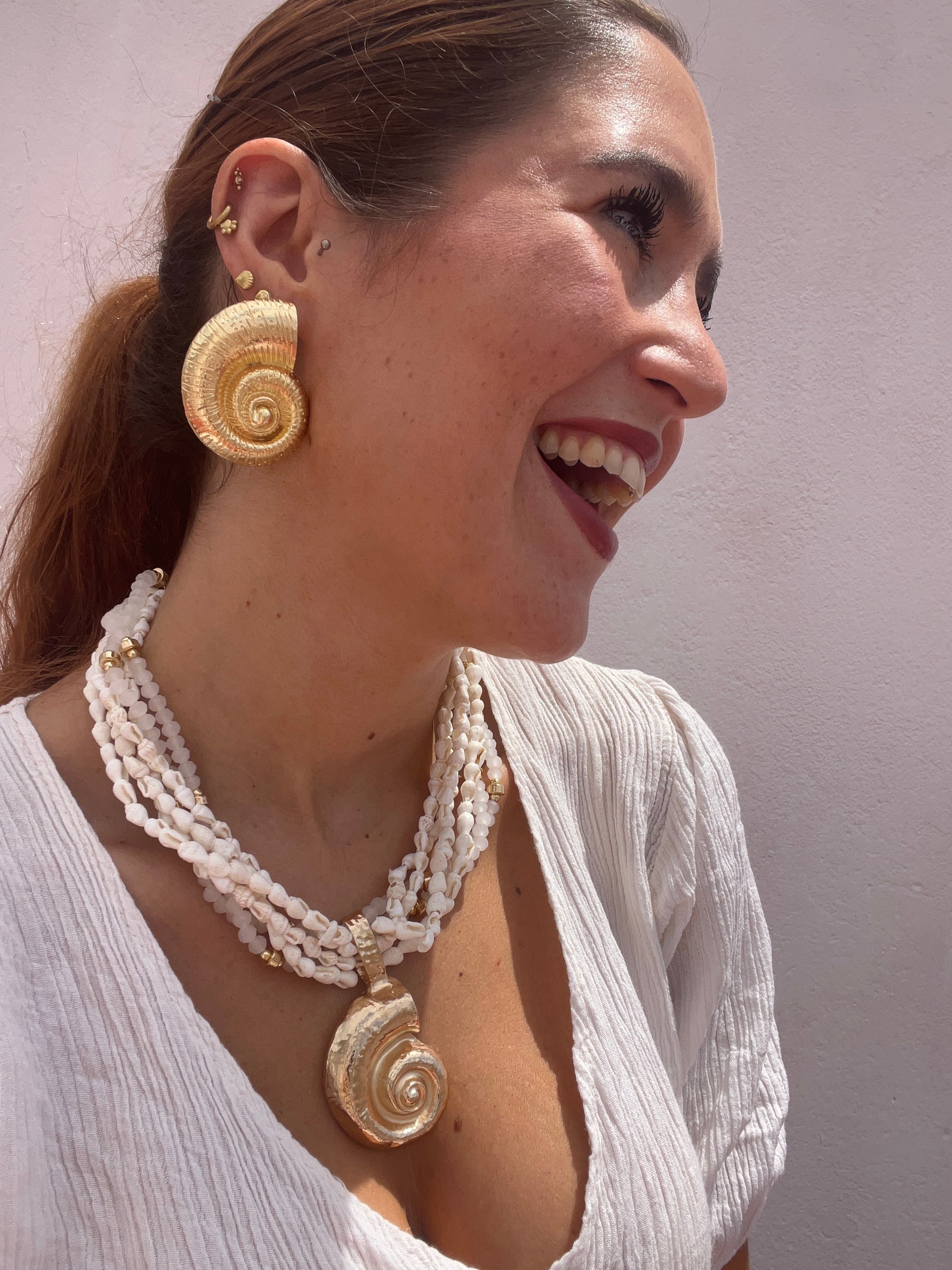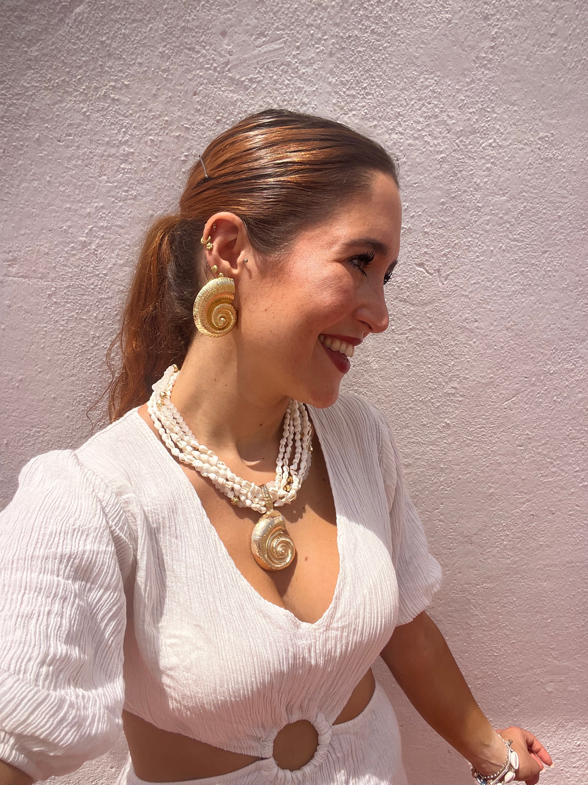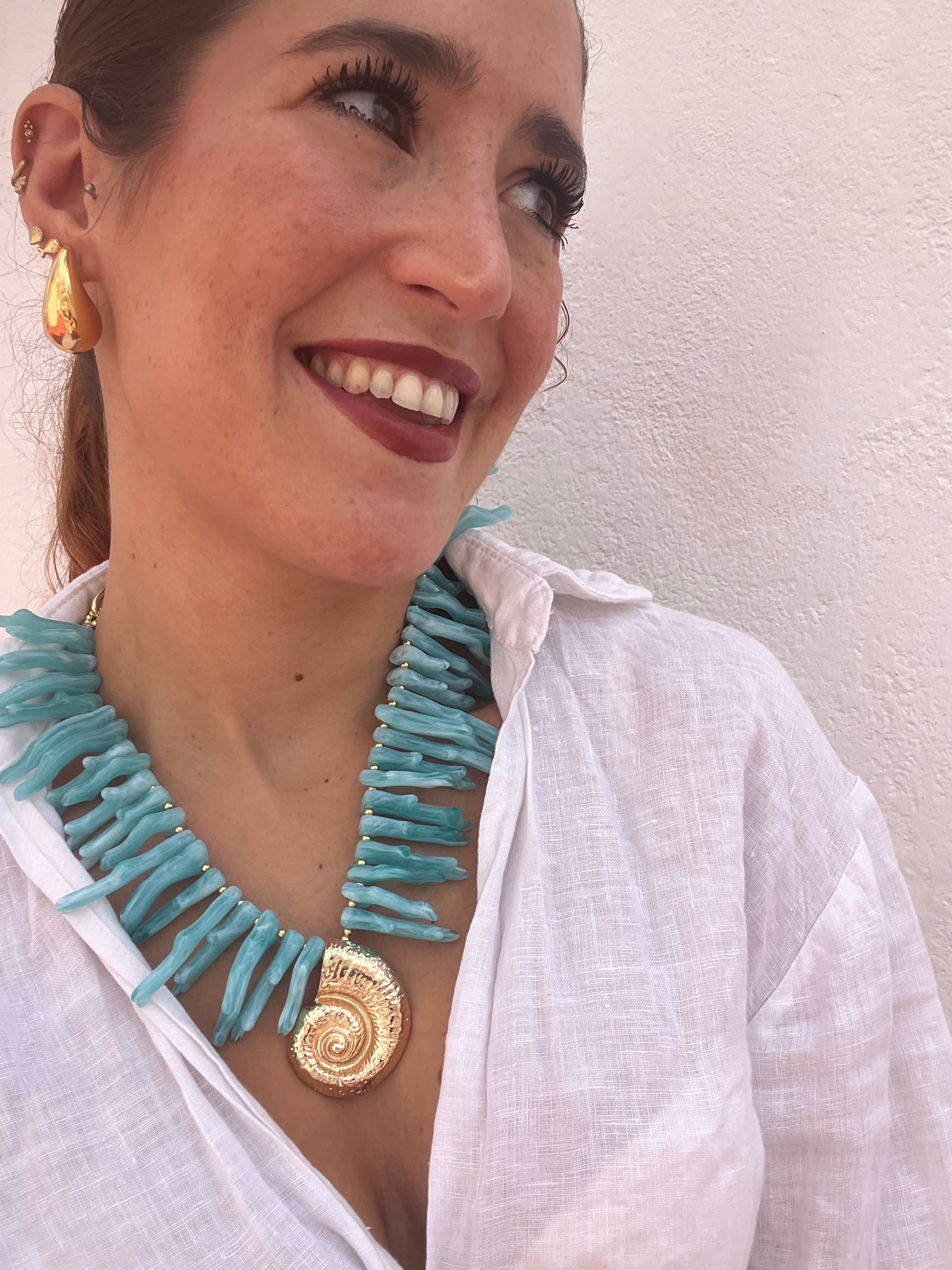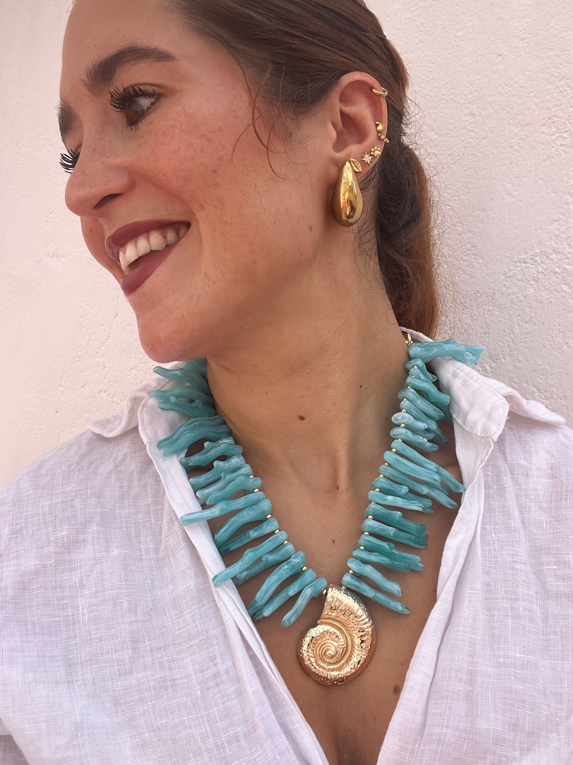 Colgante grande formado de coral color turquesa o conchas pequeñas blancas y bolitas blancas a combinación con doradas. Tiene una concha grande dorada central de zamak.