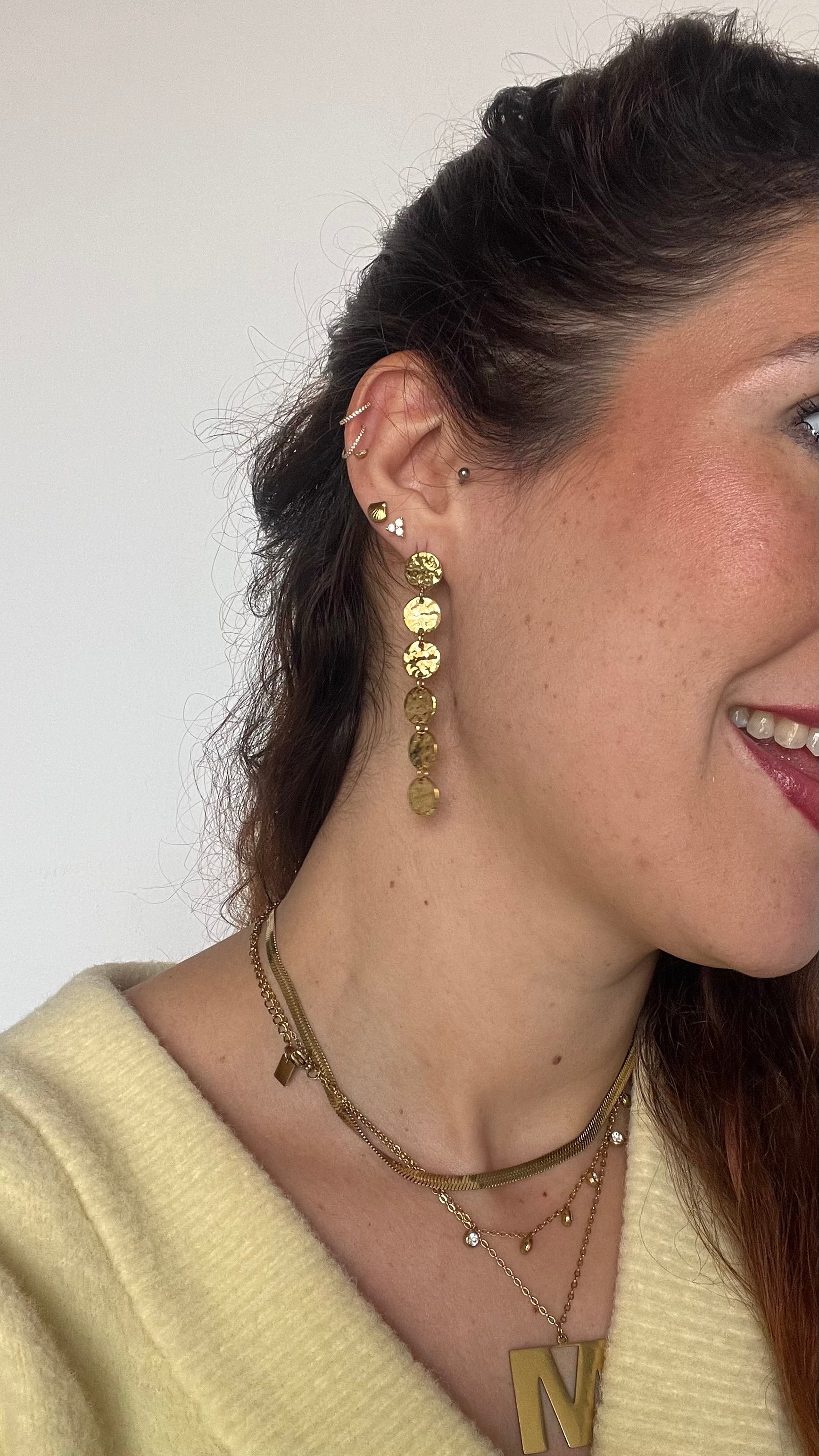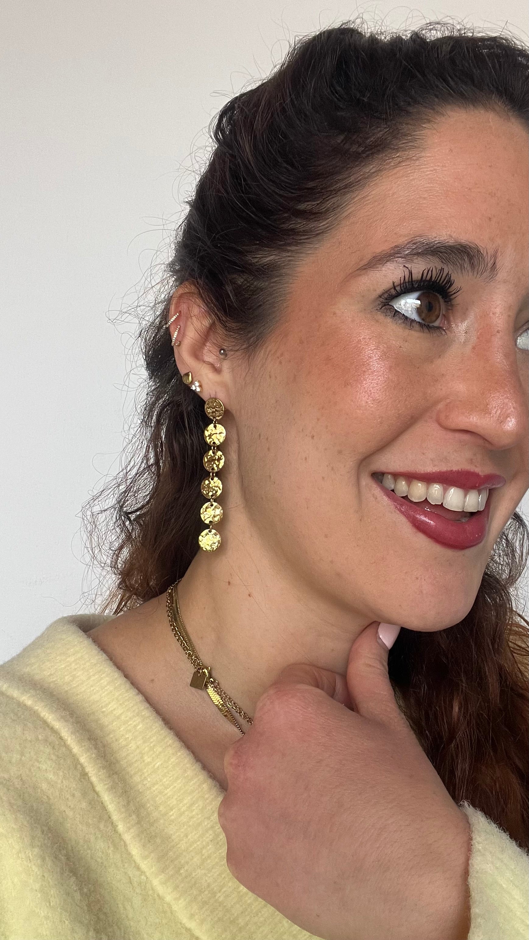 Pendientes largos compuestos por diversas círculos enlazados con anillas con decoración golpeada. Son muy elegantes y con una estética muy chic, elevarán tu look al máximo! No te quedes sin ellos!