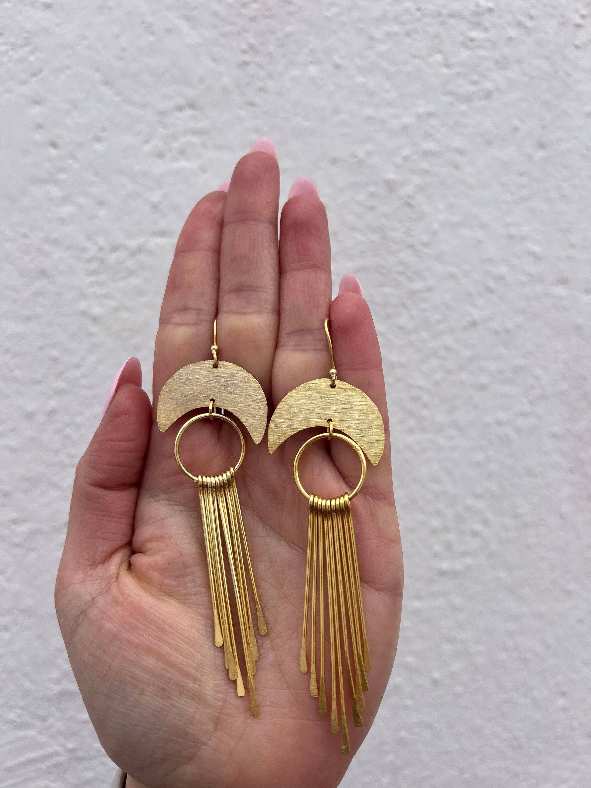 Pendientes largos de zamak formados por 3 partes engarzadas con anillas. A la parte de más arriba encontramos media luna, seguida de un circulo y de tiras planas. El material es muy resistente y no se daña ni se despinta. Son muy originales y únicos, tienen mucho movimiento y elevarán tu look al 10/10. No te quedes sin ellos!