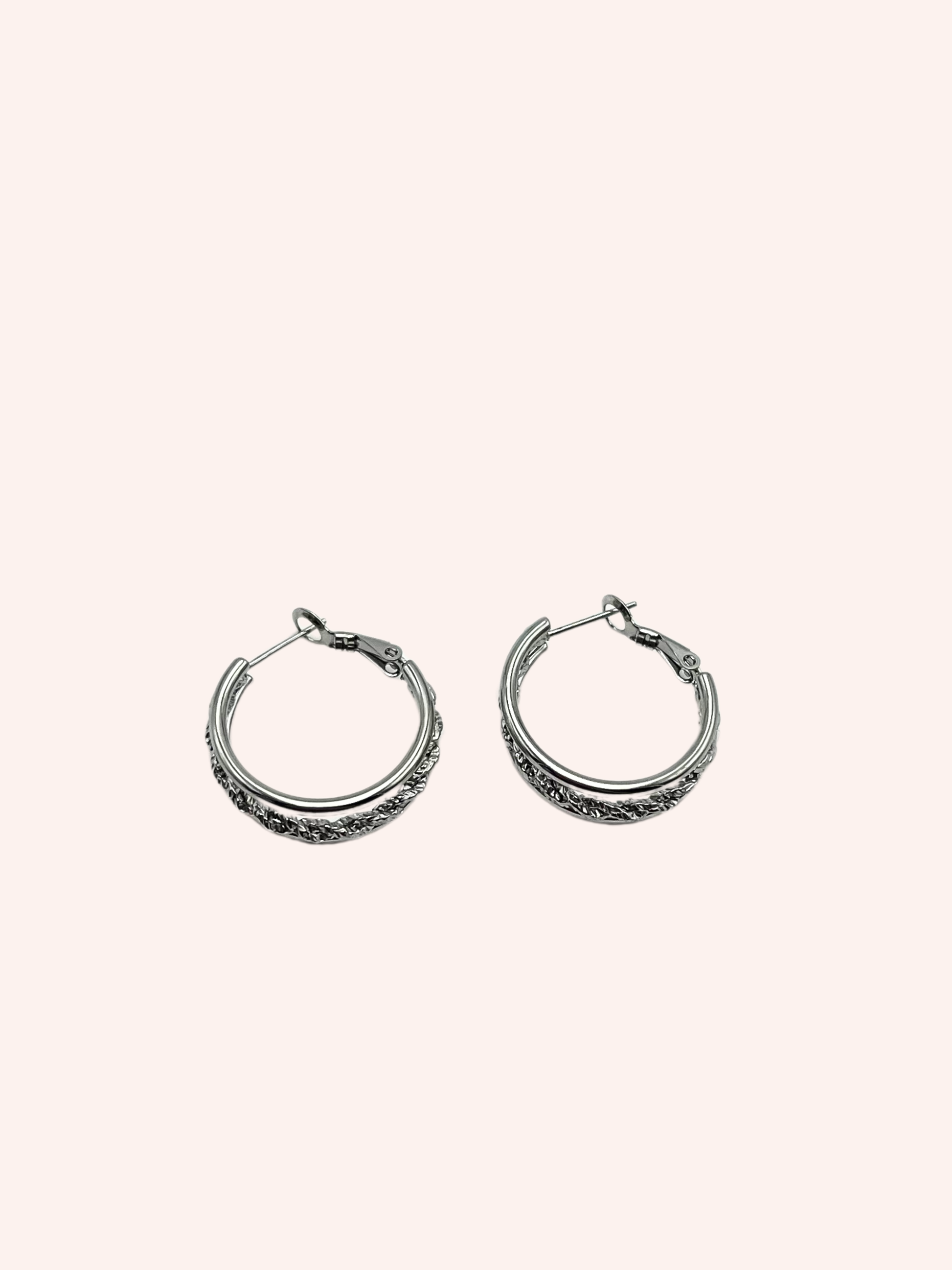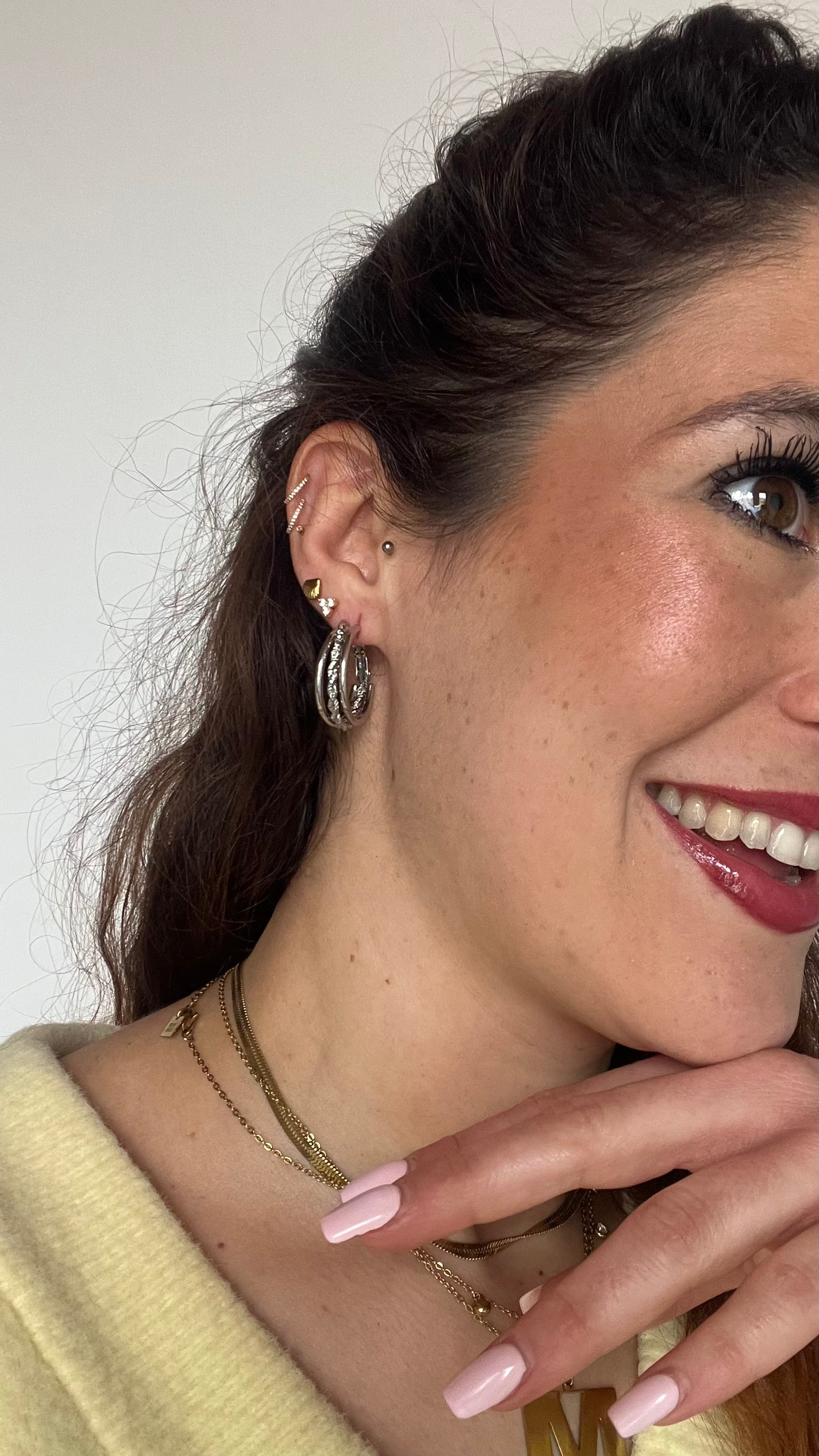Pendientes de aro de acero inoxidable, en forma de triple, el del centro tiene un diseño rizado.