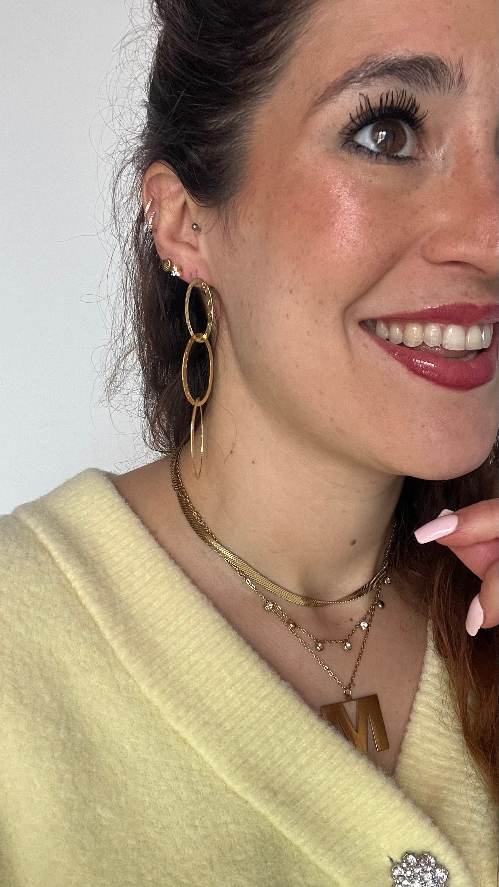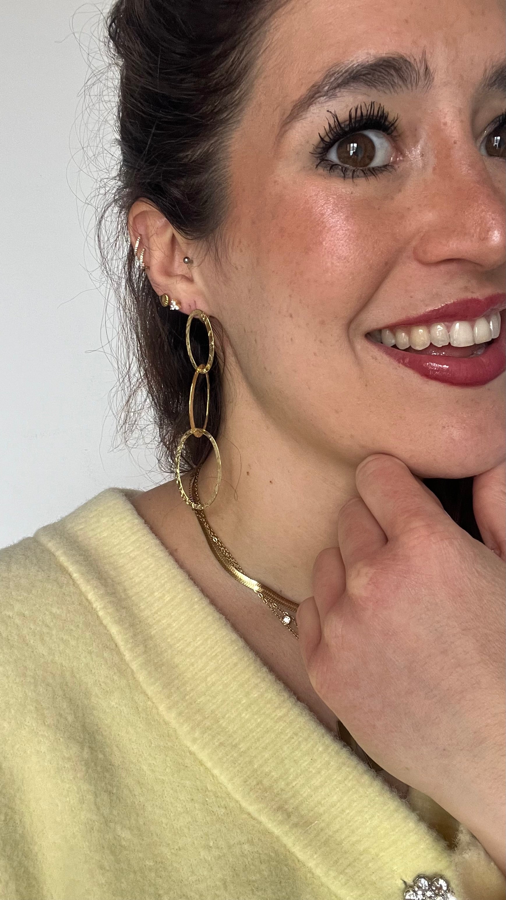 Pendientes con diseño golpeado y moderno de acero inoxidable dorados. Constan de tres aro enlazados.