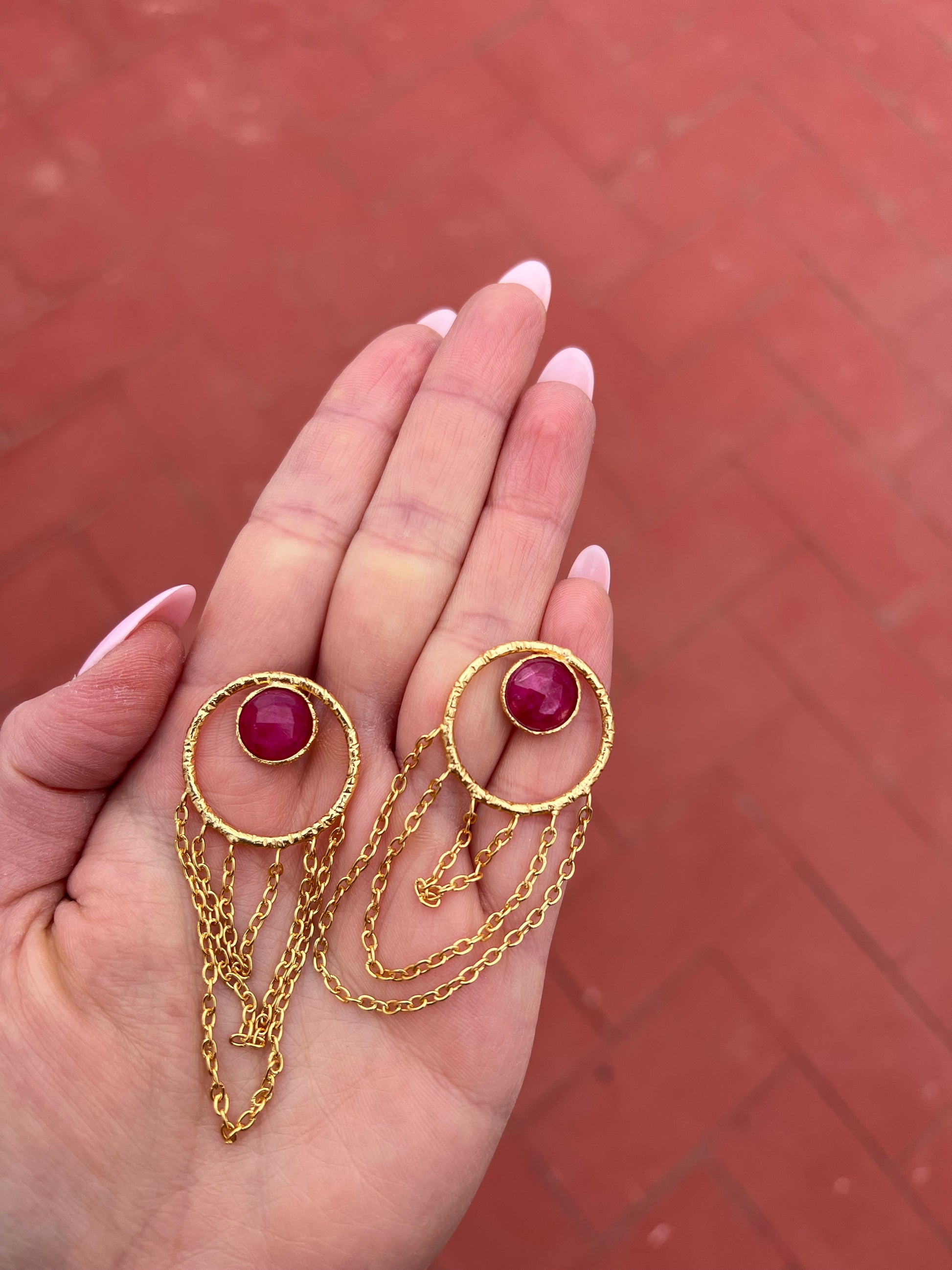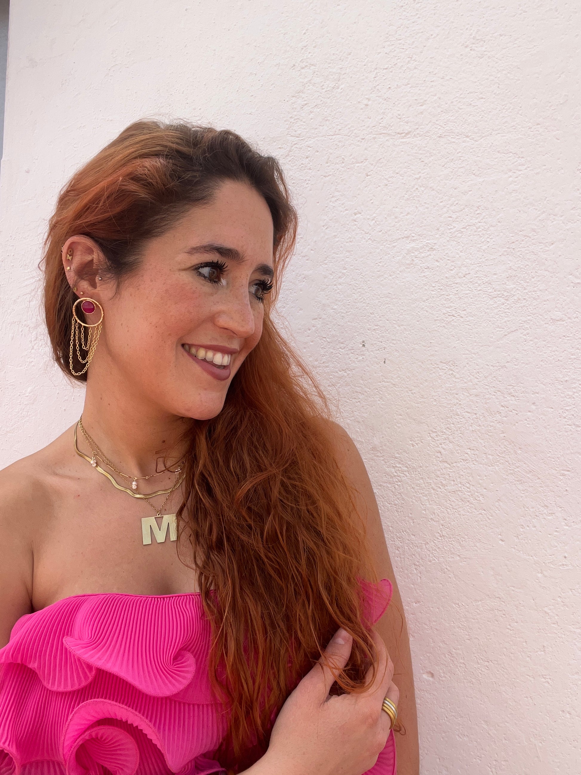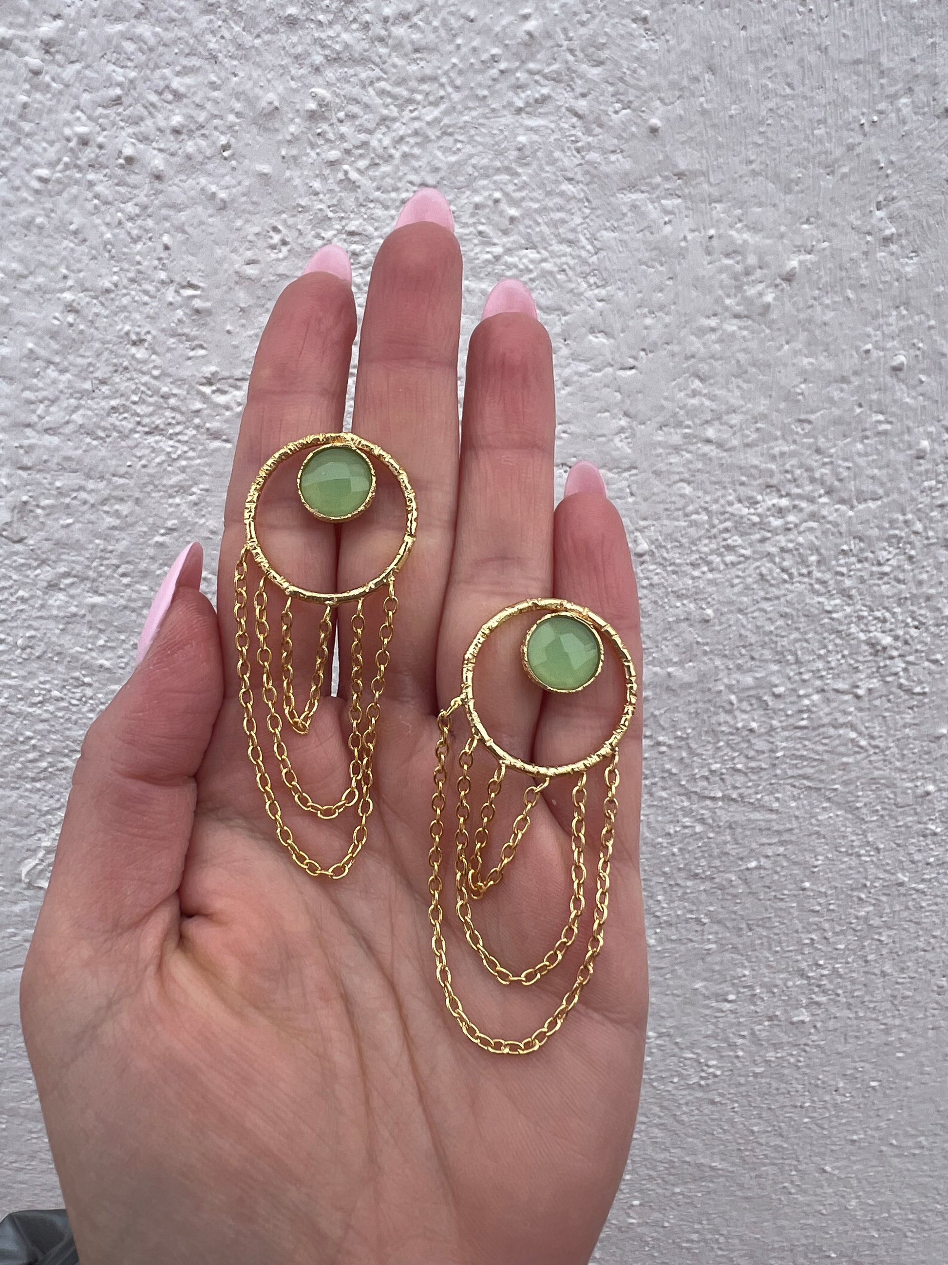 Pendientes largos de zamak formados por 1 circulo, soldado con una piedra fucsia o verde manzana, del cual cuelgan cadenas finas resiguiendo el circulo principal. El material es muy resistente y no se daña ni se despinta. Son muy originales y únicos, tienen mucho movimiento y elevarán tu look al 10/10. No te quedes sin ellos!