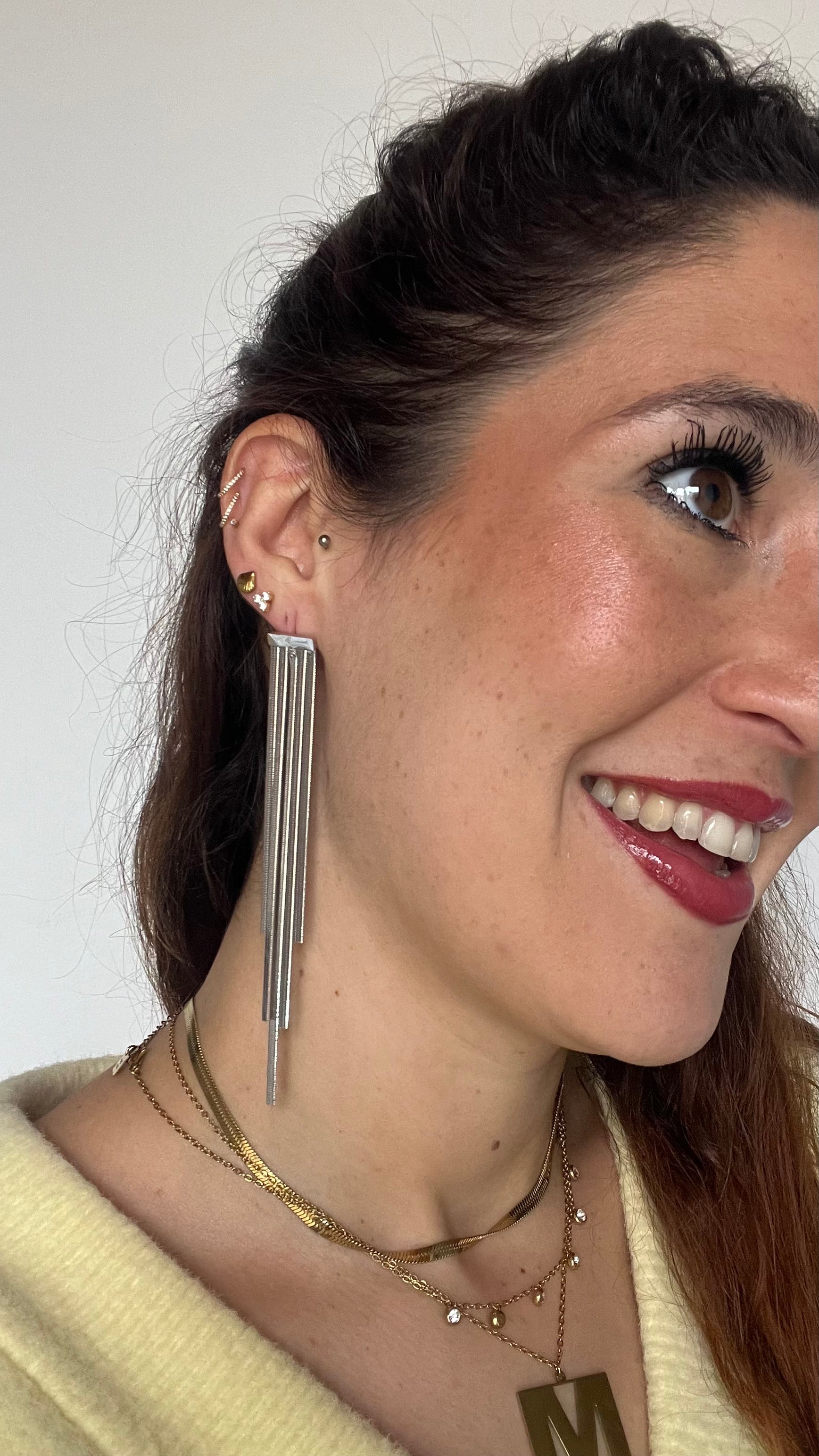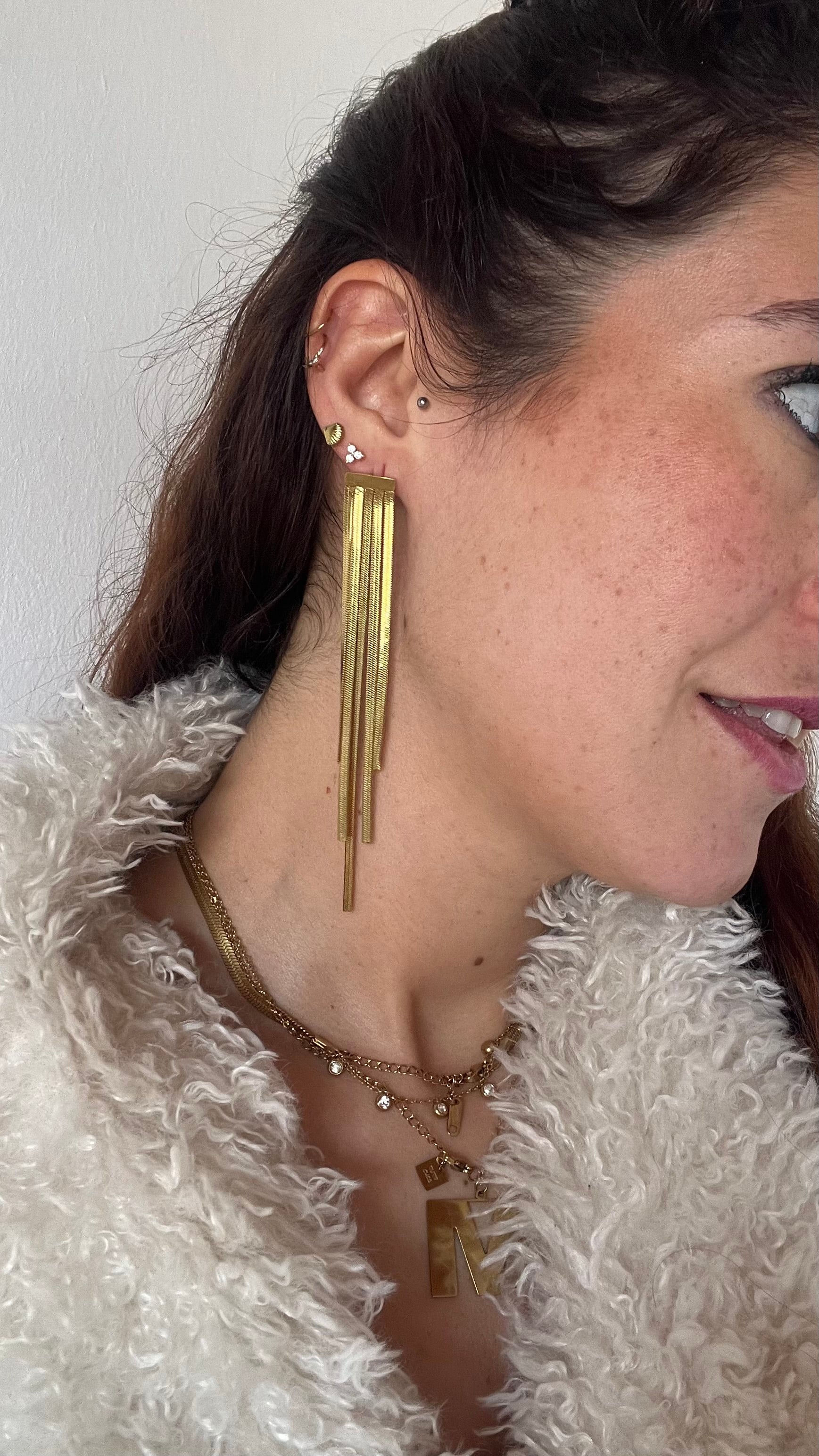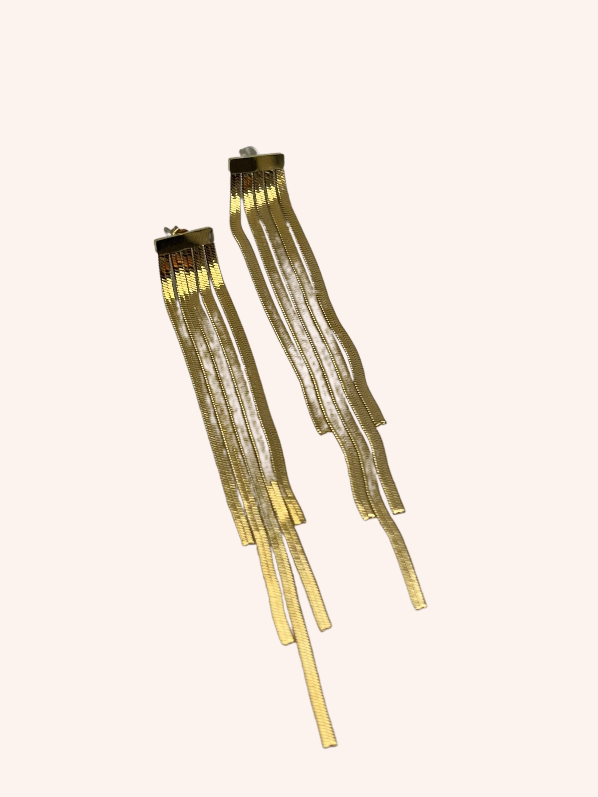Pendientes largos de fiesta con cadena plana de acero, bañados en oro. Las cadenas son finas y su movimiento es muy elegante y delicado, de corte irregular para que su caída sea preciosa.