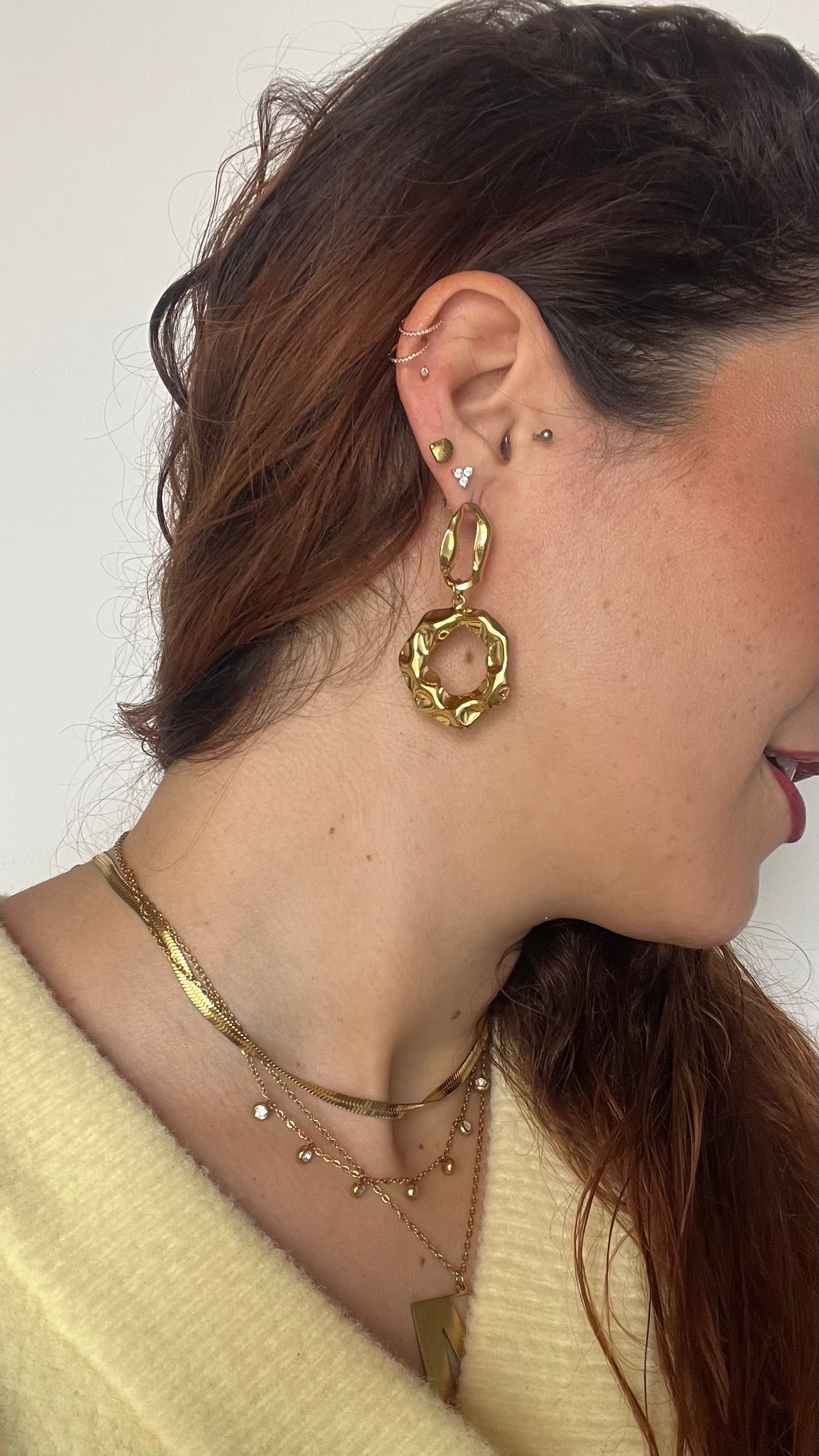 Pendientes grandes formados por dos aros huecos en la parte interior, con textura golpeada. Son preciosos, con un diseño único, elegante y original para llevar en tus looks. Son de acero inoxidable, en color dorado, te van a durar mucho tiempo intactos.