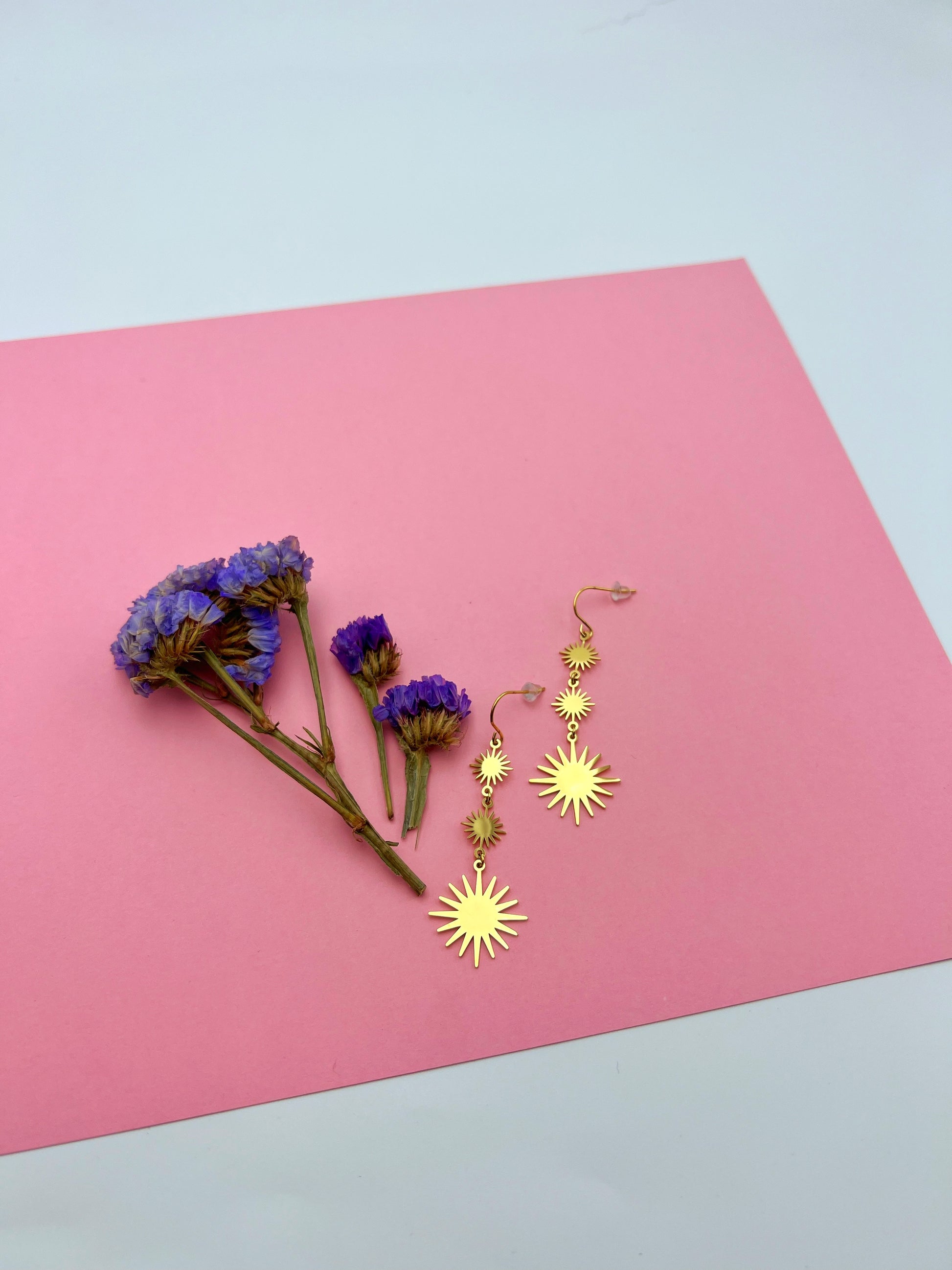 Pendientes de acero dorados formados por 3 piezas en forma de sol.
