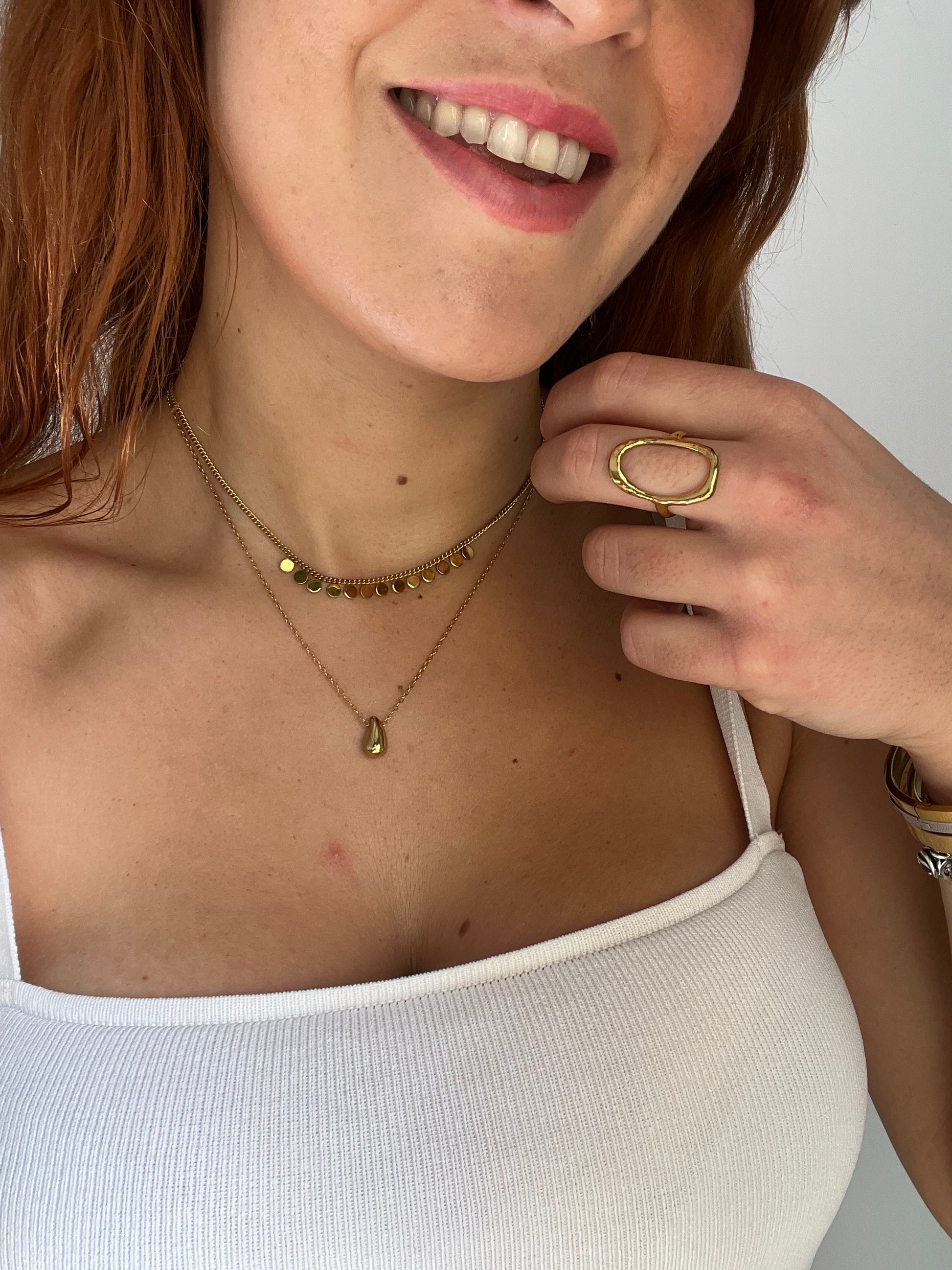 Pack de 2 colgantes de acero que puedes combinar a la vez o por separado y un anillo regulable. Todo el conjunto es dorado, de acero inoxidable.