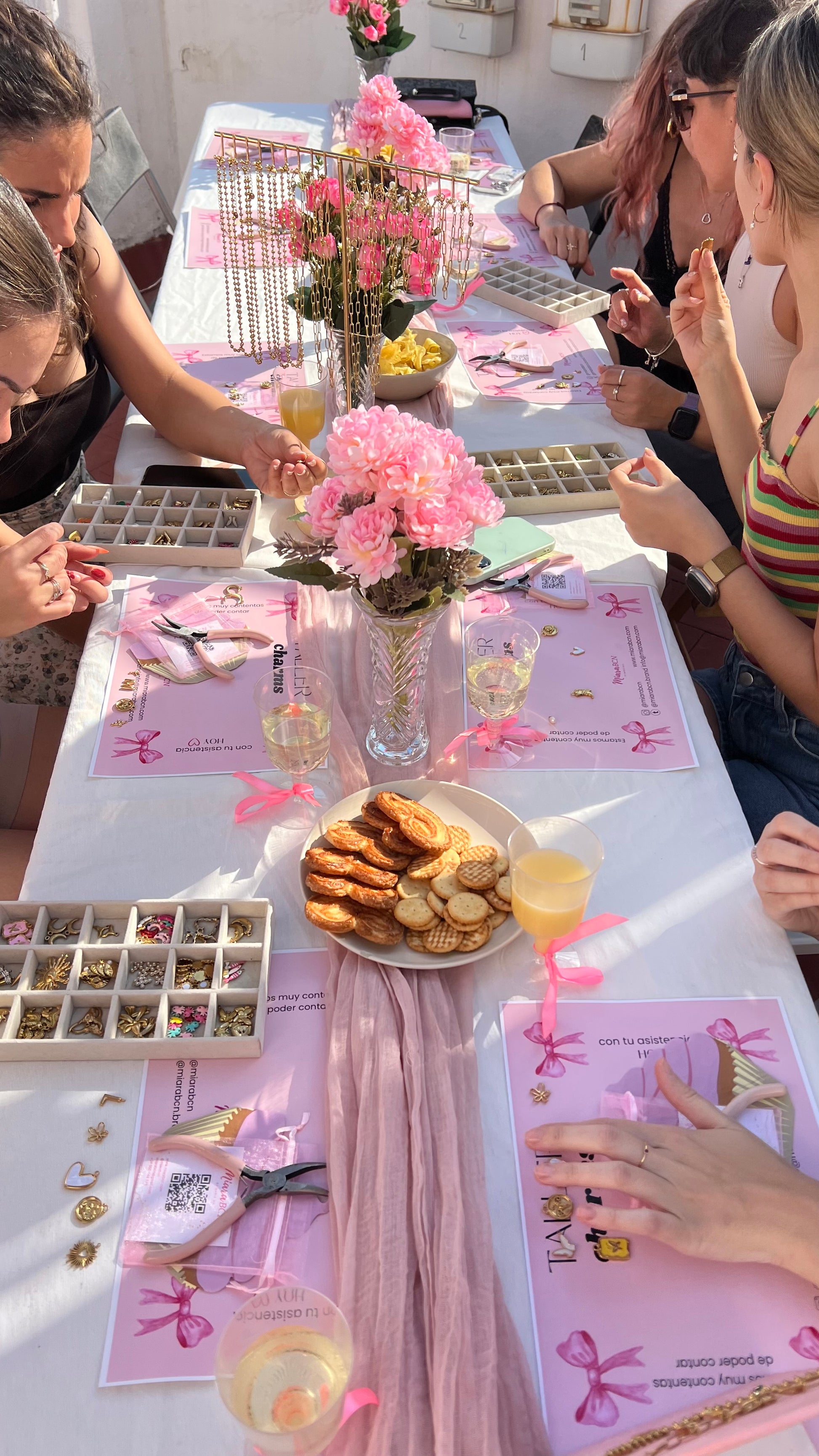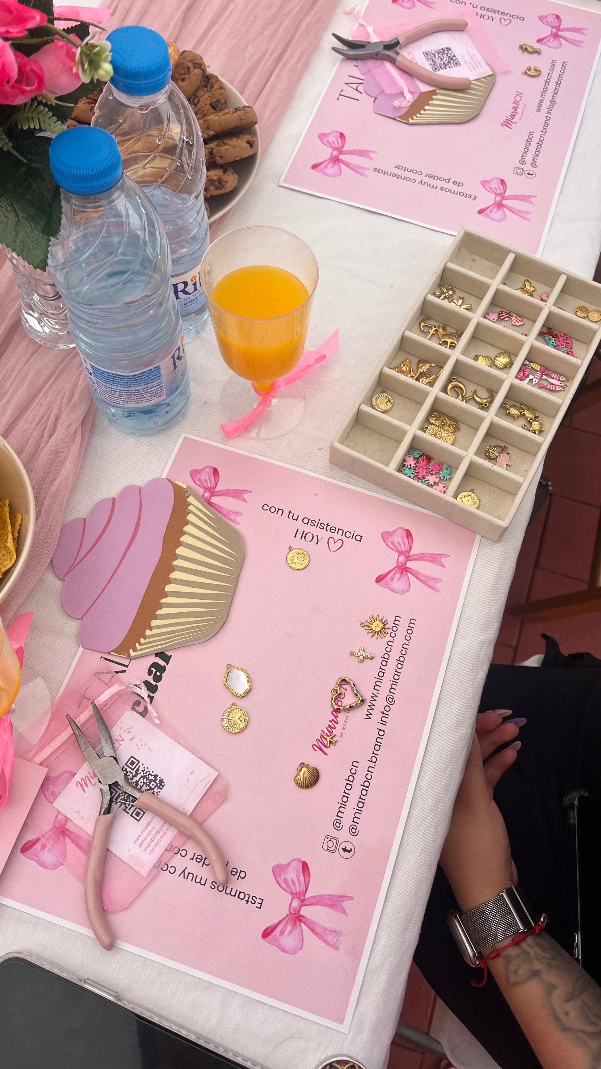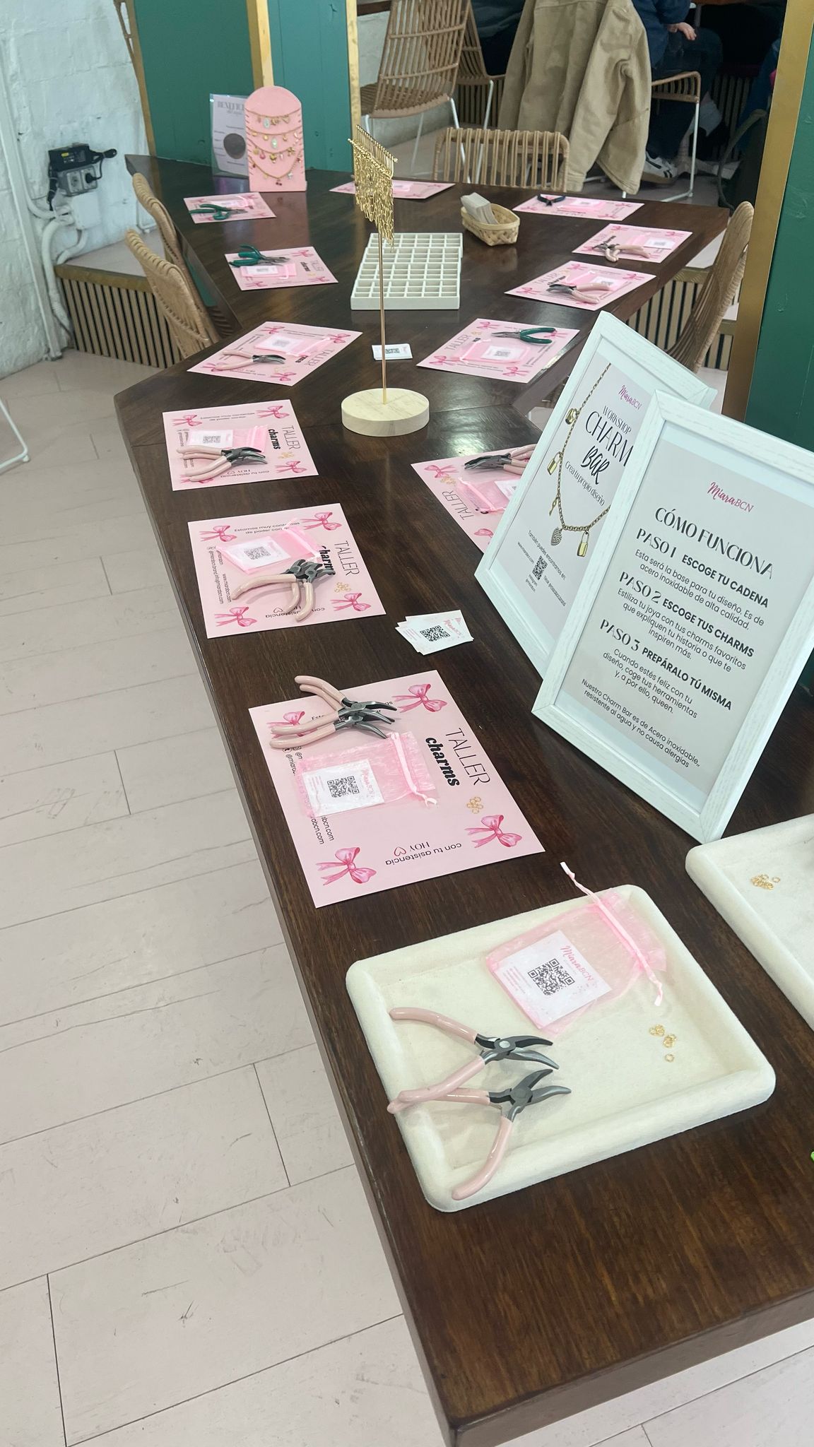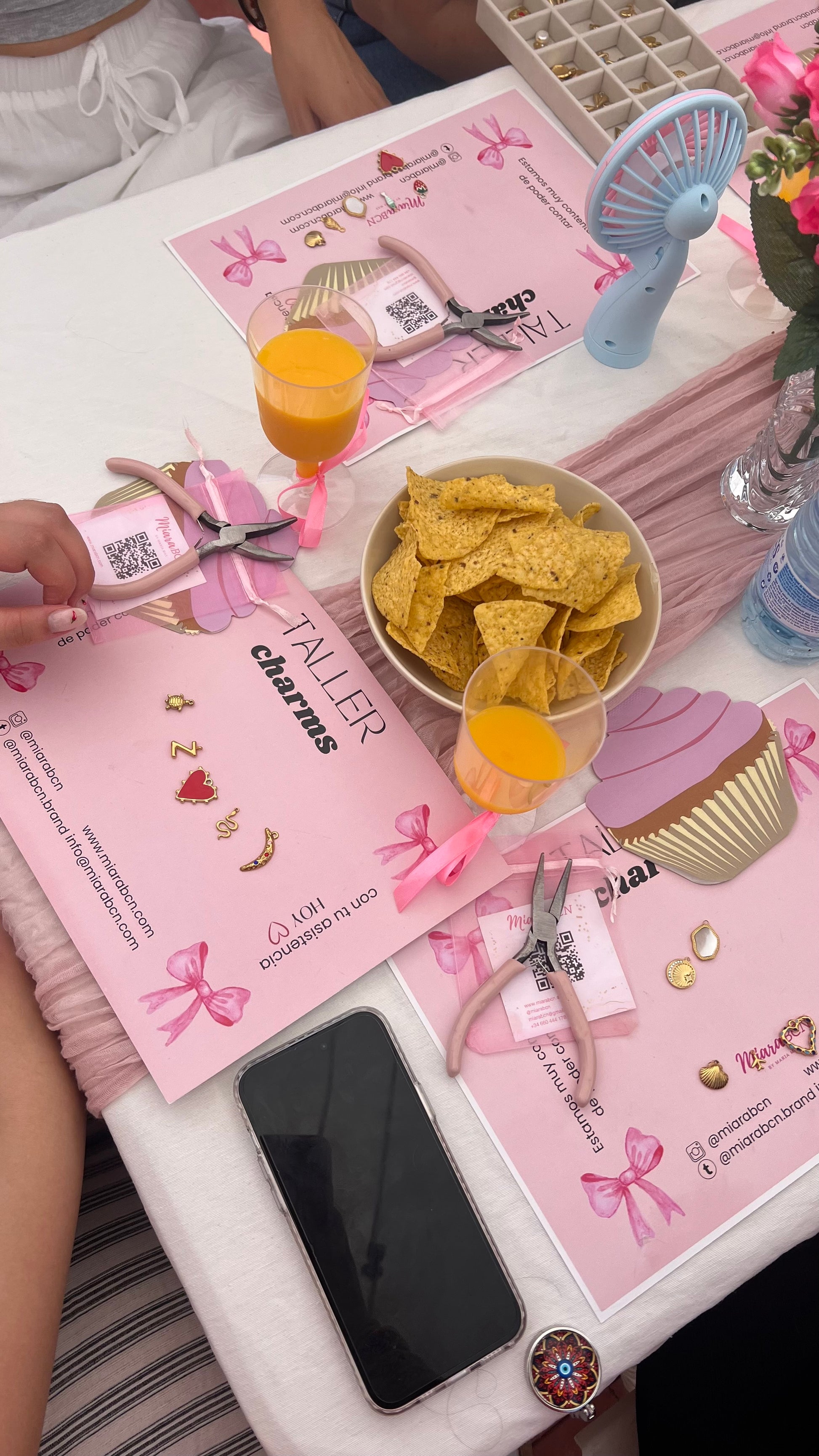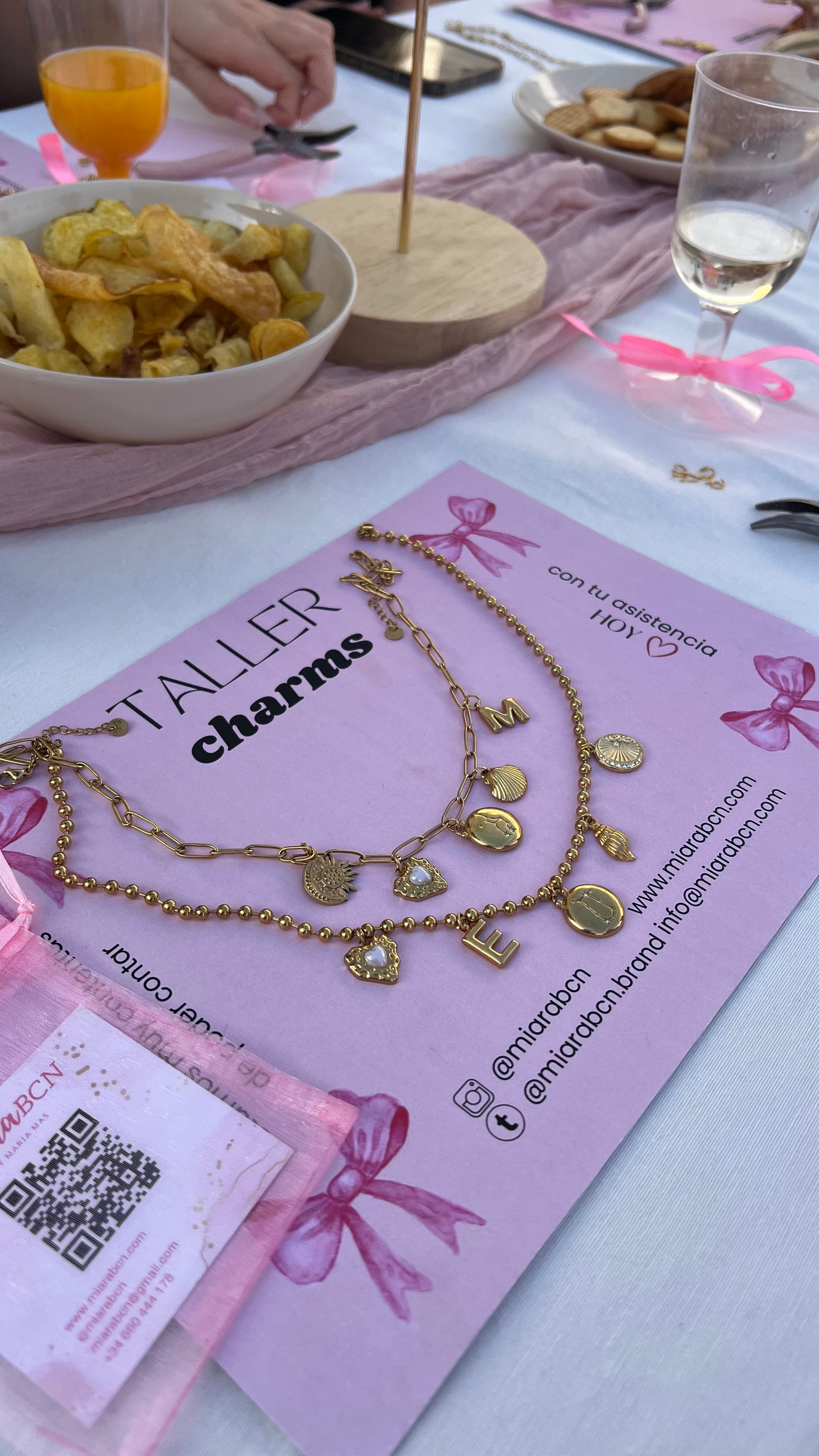 El taller incluye 5 charms y la cadena, todo de acero inoxidable de alta calidad, aperitivos y bebidas ilimitadas, herramientas, anillas y la ayuda y atención personalizada para montar tu joyita personalizada.